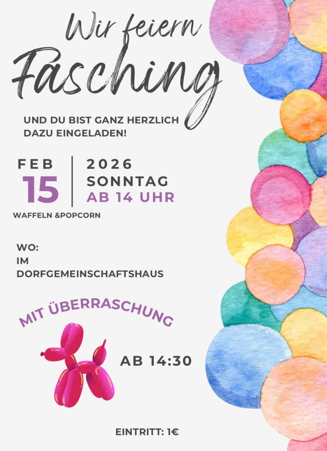 | 15.02.26 | 14.00 - 16.00 Uhr | Kinderfasching | Alter Bahnhof | |